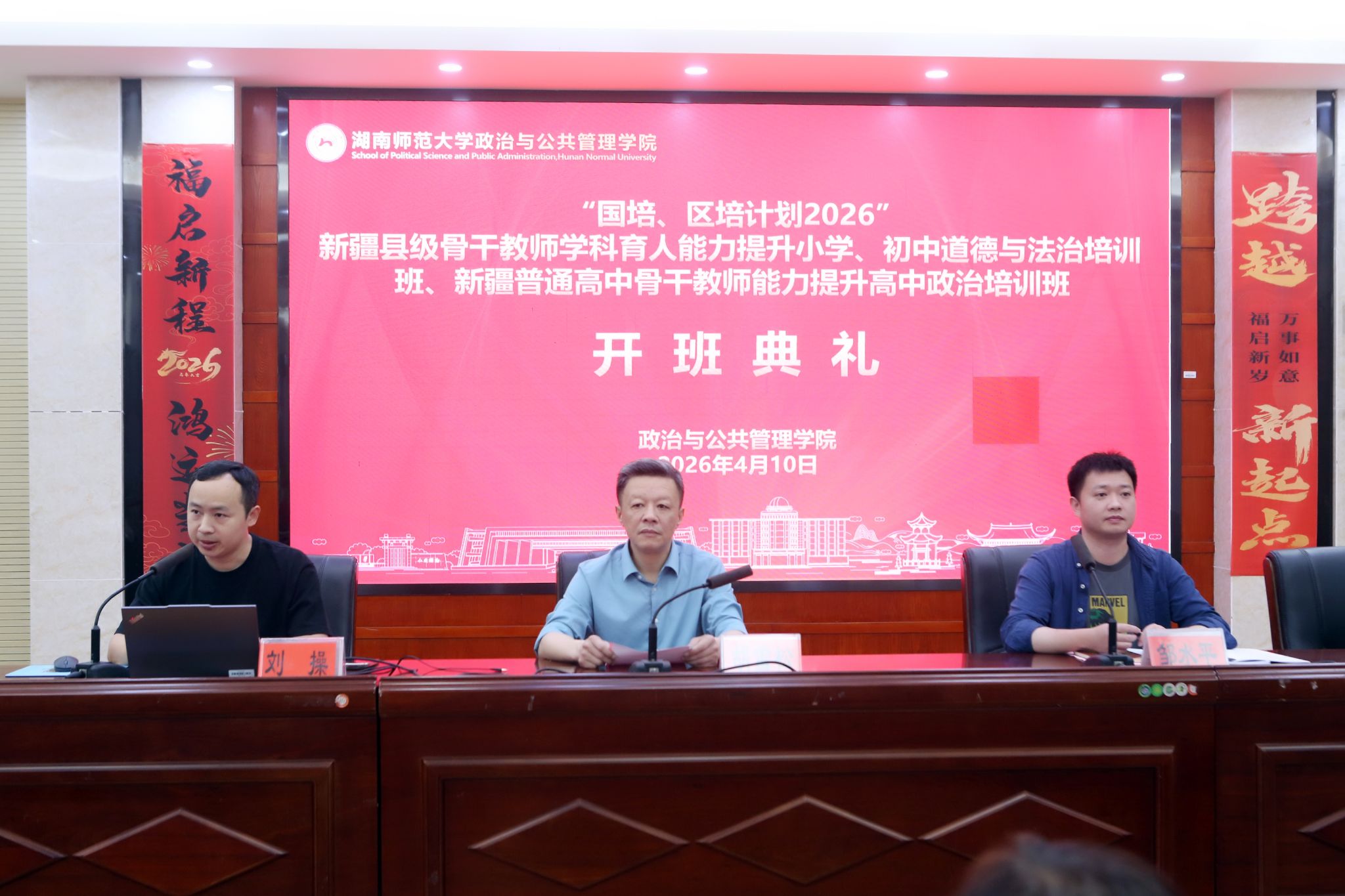 4月10日上午8:30,“国培计划2026”新疆县级骨干教师学科育人能力提升研修小学、初中道德与法治培训班(周期性)、“区培计划2026”新疆普通高中骨干教师能力提升研修高中政治培训班(周期性)在永利皇宫官方网站政治与永利皇宫官方网站顺利开班。永利皇宫官方网站副院长胡雪松、培训中心主任邹水平出席了开班典礼。典礼由永利皇宫官方网站培训中心副主任刘操主持。