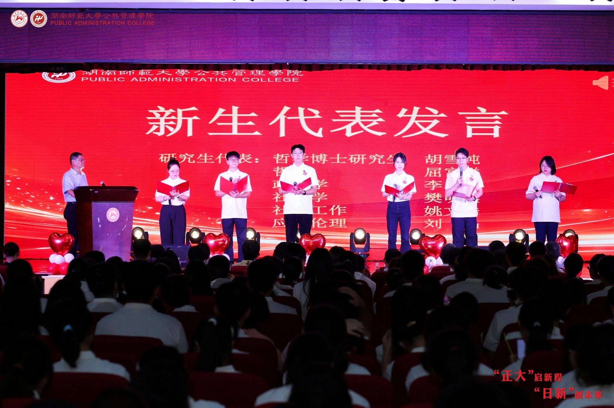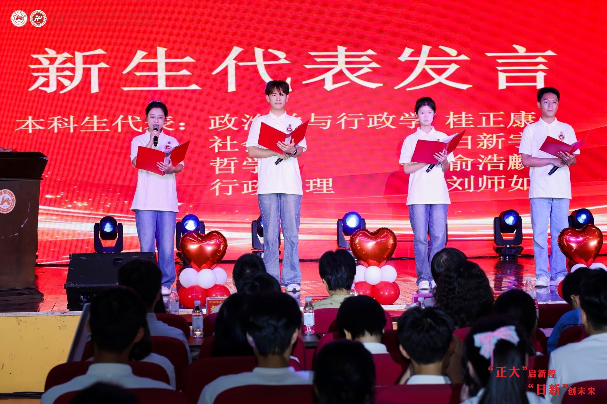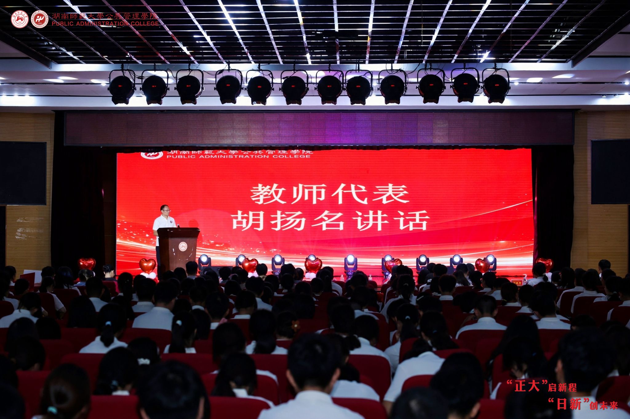 教师代表政行与行政管理系胡扬名教授围绕“立志、学习、责任、生活”四个关键词发言,鼓励新生保持“坐得住”的耐心、秉持“问得出”的勇气、锤炼“用得上”的智慧,将个人成长融入国家发展,让青春梦想助力民族复兴。