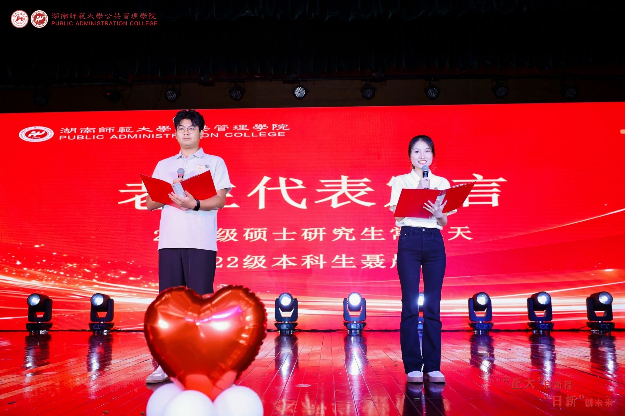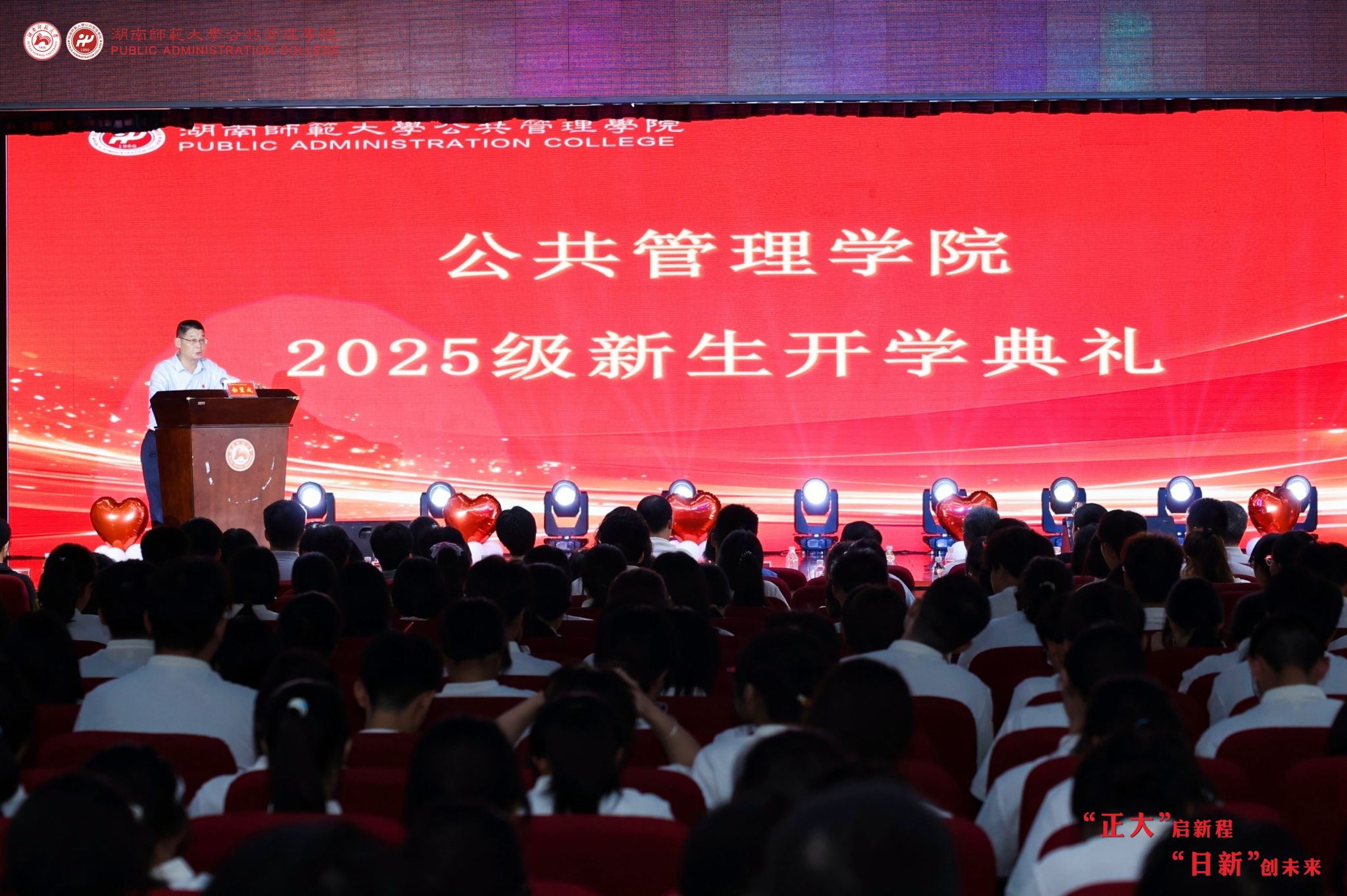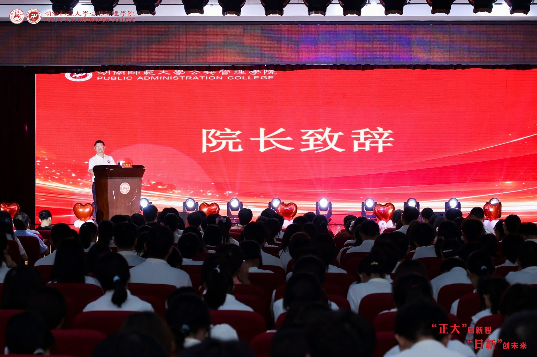 毛新志院长致辞,他向新生致以热烈欢迎,系统介绍学院发展历程与学科建设成果,并以“三心”寄语新生:以“笃行之心”筑牢理想信念,勇担时代使命,锚定人生方向;以“勤学之心”锤炼过硬本领,传承优良学风,在实践中贡献青年力量;以“修德之心”磨练高尚品格,践行“正大日新”院训,实现人格与事业、小我与大爱的共同成长。